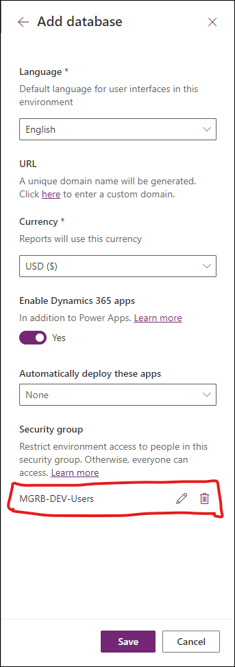- How to add a group to an Environment during creation: Create and manage environments in the Power Platform admin center – Power Platform | Microsoft Docs